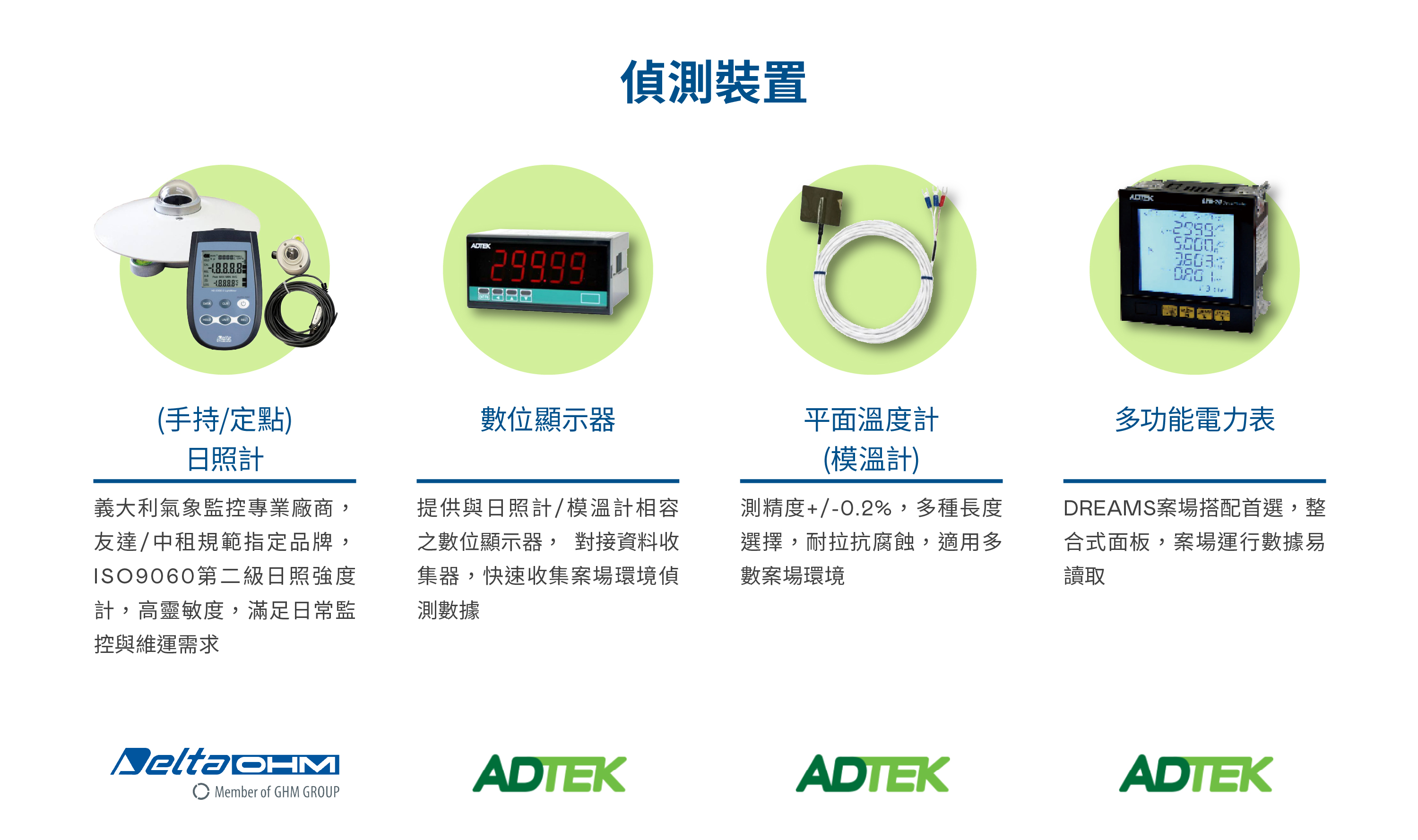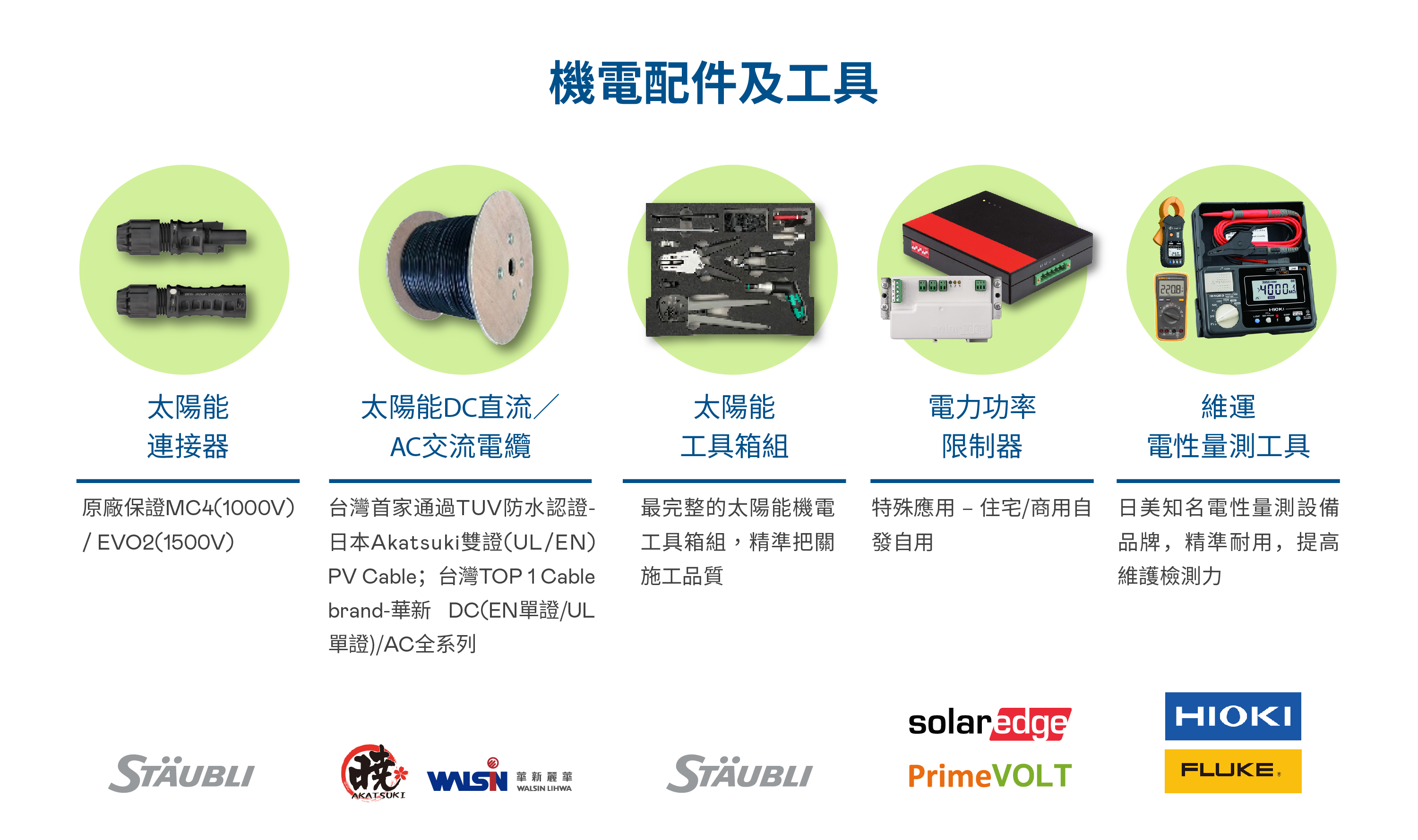 在「一站式購足」服務範疇下,js3333线路检测中心除自有太陽能模組及監控監控軟硬體整合方案外, 同時提供客戶太陽能電廠其它的可靠優質零組件品牌與產品,包含電廠的重要組件如變流器、連接器、電線電纜、環境偵測裝置及相關輔佐材料與工具。
