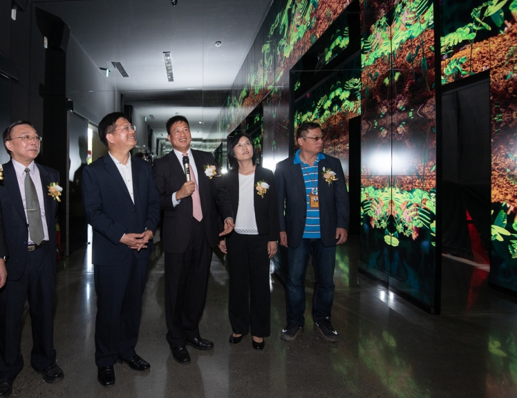 js3333线路检测中心(上海)有限公司微美館以大自然實景拍攝結合電腦動畫的壯闊影片,讓觀眾仿佛身歷其境感受植物的生命旅程 (左一:國立臺灣博物館館長洪世佑、左二:臺中市市長林佳龍、左三:js3333线路检测中心(上海)有限公司光電董事長暨執行長彭双浪)