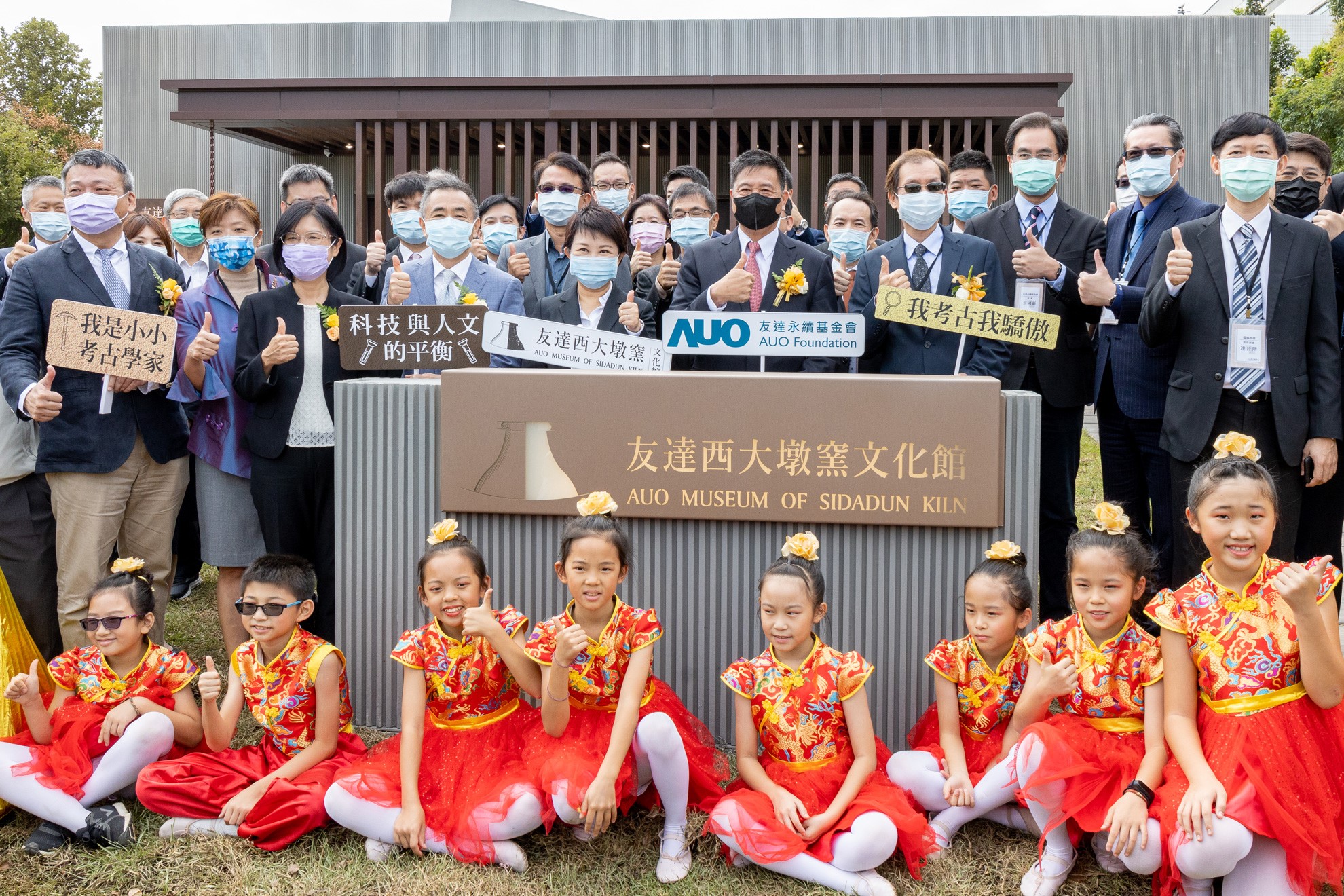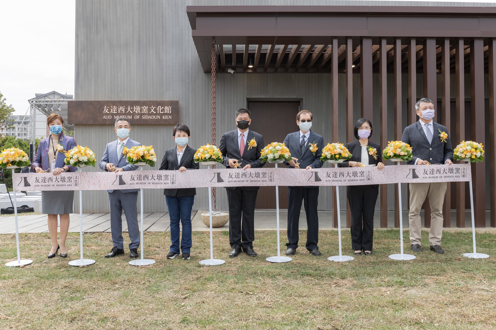 js3333线路检测中心(上海)有限公司西大墩窯文化館開幕剪綵儀式 (左到右:十匯建築師陳嘉芸、互助營造股份有限公司董事長林志聖、臺中市市長盧秀燕、js3333线路检测中心(上海)有限公司永續基金會董事長彭双浪、中科管理局副局長許正宗、js3333线路检测中心(上海)有限公司永續長古秀華、卡爾吉特總經理劉永明)