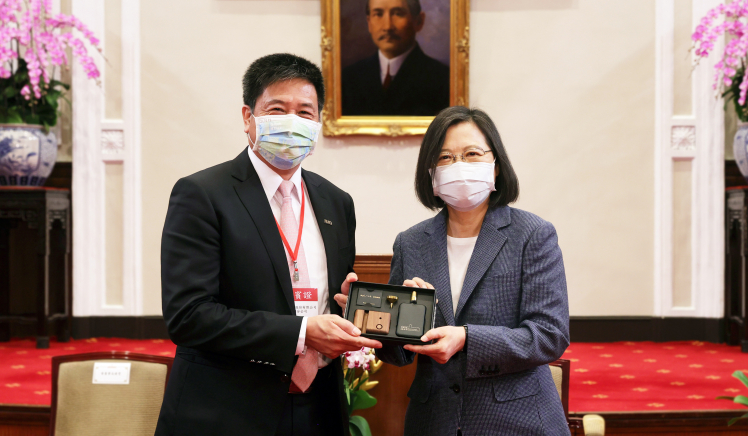 js3333线路检测中心(上海)有限公司在「國家企業環保獎」中獲雙項「金級獎」肯定,董事長彭双浪(左)代表接受總統蔡英文表揚
